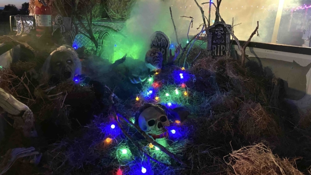 As the Culture and Relations Manager for the Town of Hudson, Colorado, part of my job is to plan and produce all Town events.  In a small town, you don’t always have all the resources one might want, so you improvise. In Hudson’s Memorial Park, there was almost light at night. To have the Harvest Festival and Trunk or Treat this year, I needed light. The solution was to wire the park with nearly 700 feet of heavy-duty extension cables. I then bought lights that can be controlled from a phone and placed them on 8-foot boards that I painted and screwed into the park fence, as seen in the shots below.